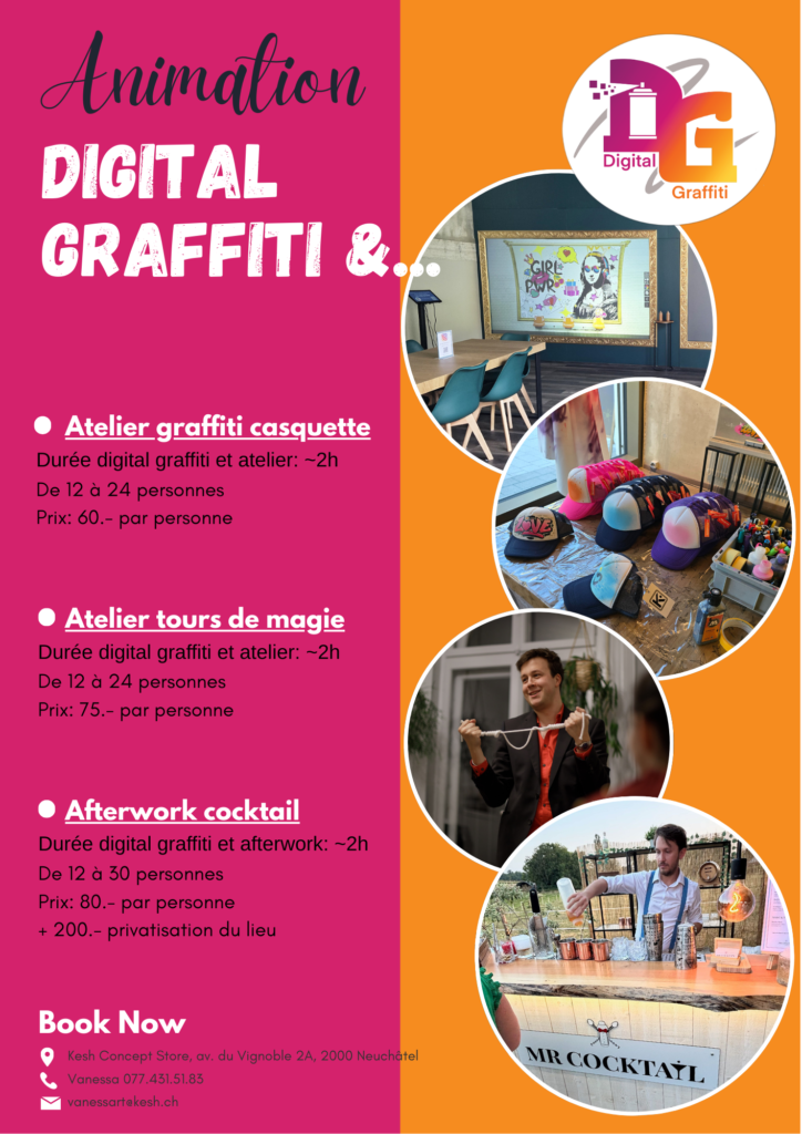 Fêtez votre anniversaire de manière originale avec une session de digital graffiti au Kesh Concept Store ! Laissez libre cours à votre créativité sur nos écrans géants et créez des œuvres uniques avec vos amis ou votre famille. Jusqu’à 12 personnes, partagez un moment fun et immersif, avec des options de personnalisation pour rendre cette journée encore plus mémorable !